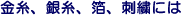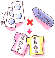 金、銀は防虫剤の化学変化により変色することも。金糸、銀糸、箔、刺繍には和服しょうのう、ピレスロイド系の防虫剤を。 |