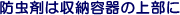 防虫剤は空気より重い気体となり、上から下へと流れて衣類を守ります。防虫剤を入れるときは、容器の4隅の上部に入れるのが効果的です。 |
