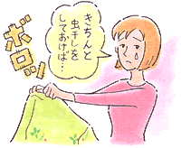 天然繊維の絹は虫の害を受けやすいものです。その上湿気の多い日本の風土は、カビの生えやすい条件でもあります。虫干しは害虫の点検やカビを防ぐもっとも効果的な方法で、年に1~2回は必ず行いましょう。 |