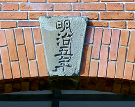 右・東繭倉庫の中央アーチ部分には、アーチを固定する要石があり、建設された「明治五年」の文字が彫られている