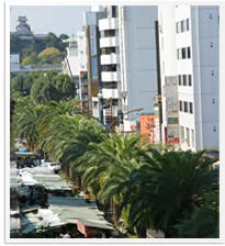 300年余の伝統がある土佐の日曜市。追手門に向かって1.3キロにわたって露店が並びます。写真奥には高知城の天守閣も見えます。