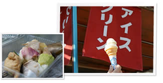 日曜市名物、地元っ子にも人気のアイスクリーンと田舎ずし。アイスクリーンはシャーベット状のさっぱりアイス。田舎ずしはミョウガやタケノコ、こんにゃくを柚子の香りいっぱいのすし飯にのせたもの。どちらも素材重視の素朴な味。