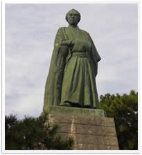 名勝桂浜・竜頭岬の丘の上から太平洋を睨む龍馬像。銅像は、慶応3年(1867)に長崎で日本初のプロカメラマン上野彦馬により撮影された写真をもとに、高知県内の青年たちの募金によって昭和3年に造られました。