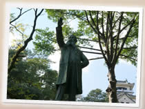 高知城にある板垣退助の銅像。上士の家に生まれた板垣は、山内容堂の側近として勤王党を取り調べた。後に討幕運動を主導。明治になると自由民権運動の急先鋒となり、自由党を結成。党首となりました。
