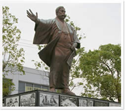 安芸駅から徒歩3分ほど。市役所手前の江の川公園内にある弥太郎の銅像。岩崎弥太郎の没後150年に記念して建立されました。