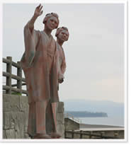 龍馬の死後、海援隊士・千野寅之助に嫁いだ妹・君江の住む芸西村和食に、お龍は1年ほど身を寄せました。お龍と君江の銅像が建つのは、名勝琴が浜。桂浜の龍馬像に向かって、お龍が手を振っています。