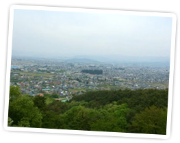 舘山公園から見た米沢市街地、中央の緑地は、上杉家御廟所、右が上杉神社