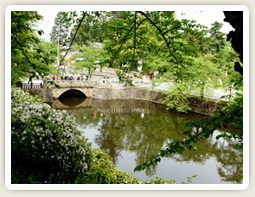 慶長6年(1601)、景勝が城主となった米沢城があったところ。敷地内には上杉謙信を祭神とした上杉神社、景勝や上杉鷹山、兼続らを祀った松岬神社、上杉ゆかりの重要文化財を収蔵する稽照殿などがあり、周囲を錦鯉の泳ぐ濠が囲んでいます。