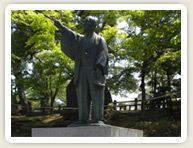 ![]() 米沢藩を立て直した第9代上杉治憲こと鷹山公の銅像が着用しているのは、直江袴といわれる兼続考案の実用的な袴。 |