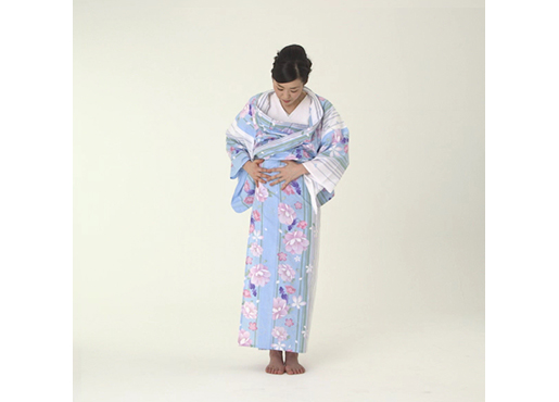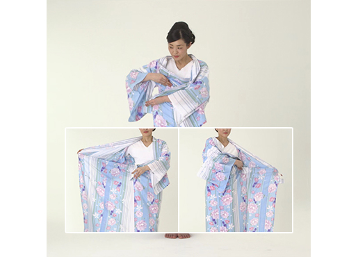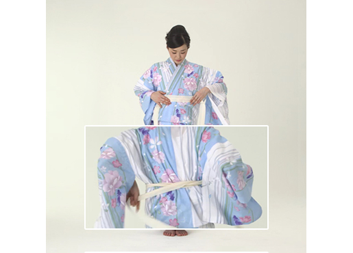 「身八つ口」から背中へ両手を入れ、後ろの「おはしょり」の整理をします。